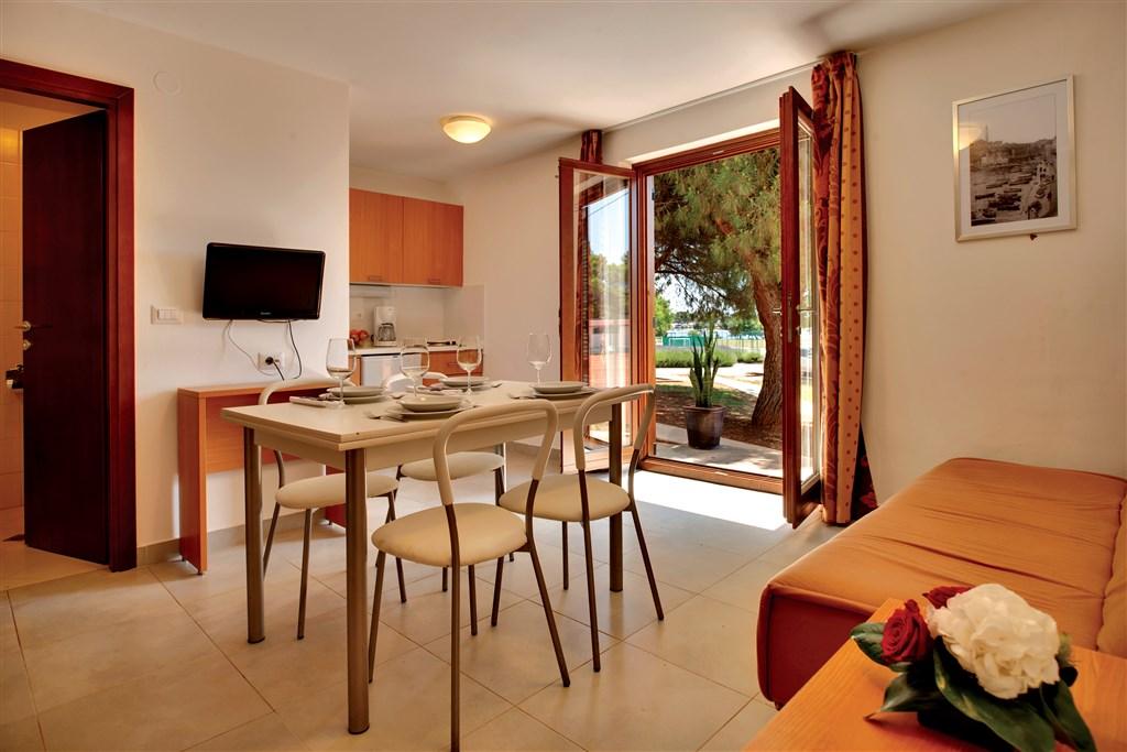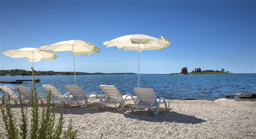 ve stylu istrijské vesničky • pavilony a apartmánové domky • kamenito-oblázková pláž 50-300 m • upravené plochy na slunění • zrekonstruované společné prostory • lehátka a slunečníky za poplatek |