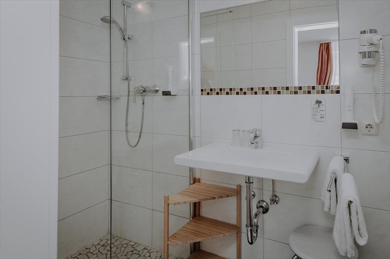 | pokoje mají koupelnu s WC, TV-Sat, balkon. 2 lůžkové pokoje jsou cca 20 m2 veliké, 2-3 lůžkové cca 23 m2 a rodinné (2 místnosti) cca 35 m2. |